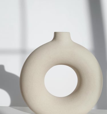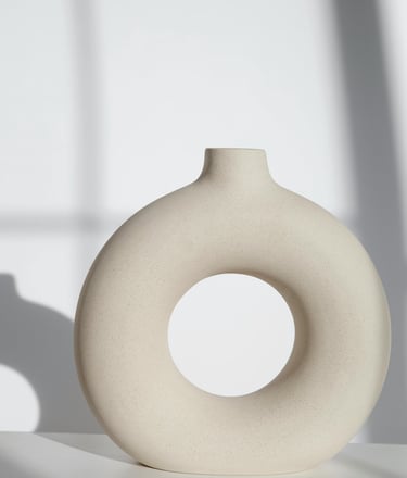 The white vase with an open center — brings balance and airiness. Its form is both minimal and expressive — a subtle statement piece that doesn’t try too hard. It pairs beautifully with delicate stems or even left empty as a sculptural object.